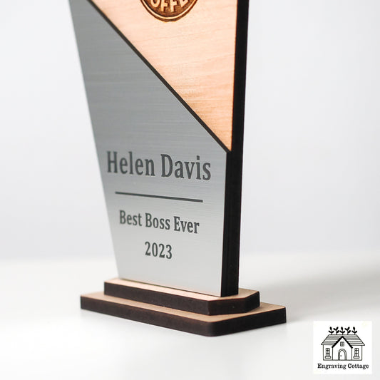 200mm Wooden Trophy Award With Logo & Engraved Wording For Schools, Football, Dance, Corporate