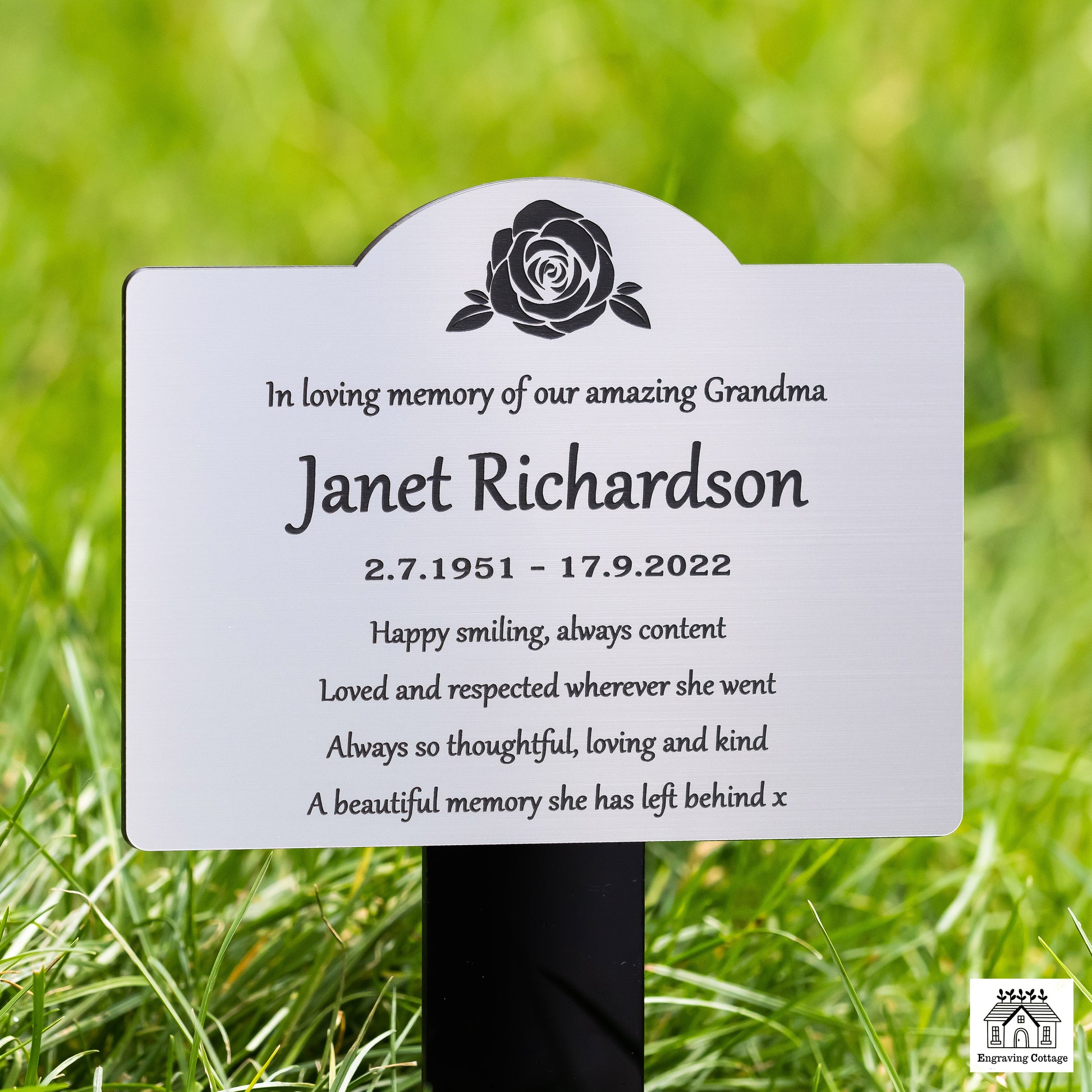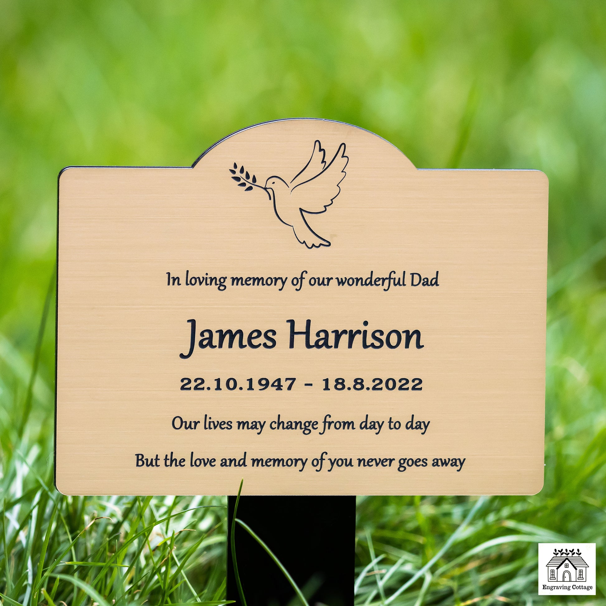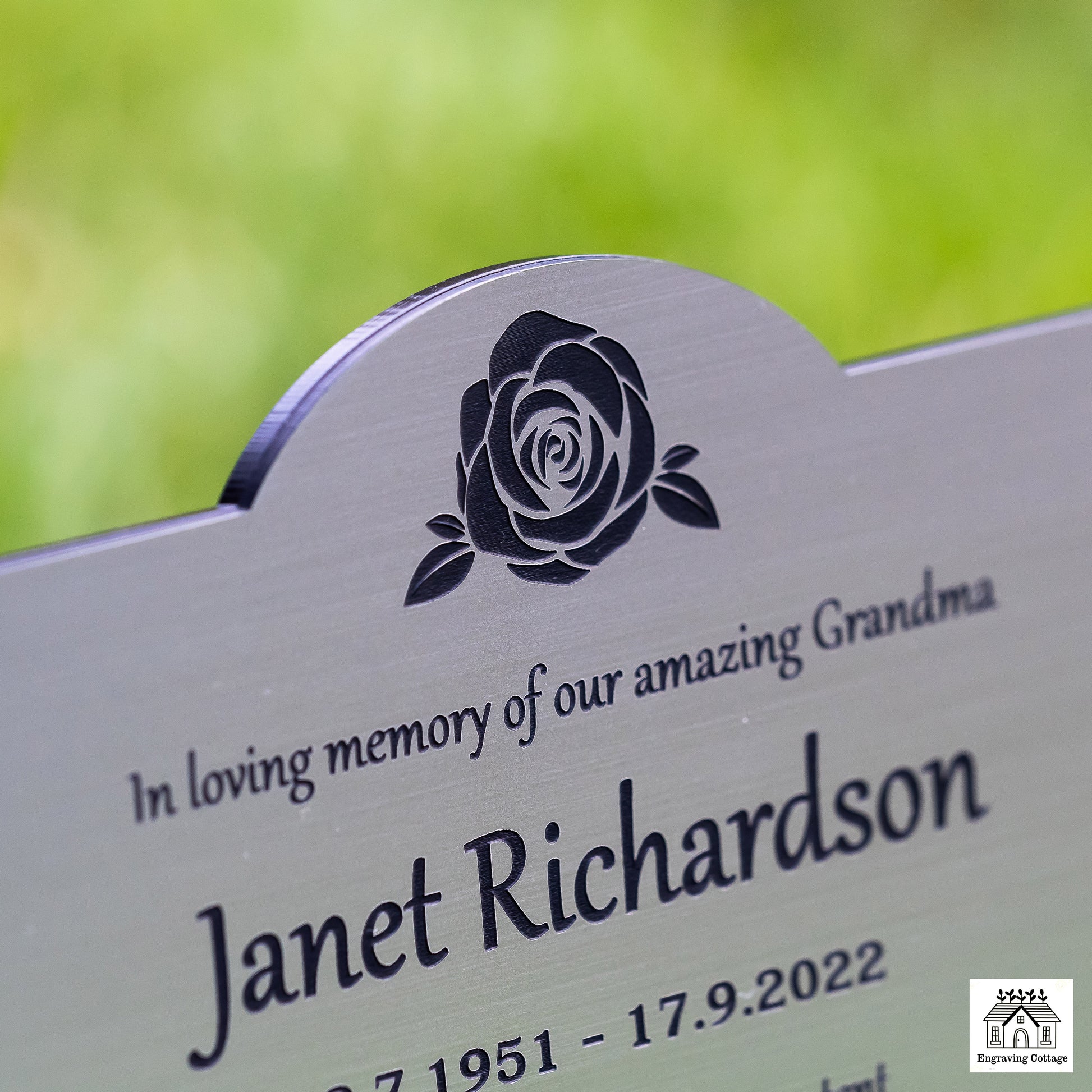 Our grave / tree markers are professionally engraved with a words and design of your choice, this marker is available in a variety of colors including gold, silver, and black, and is made from durable and high quality metallic finish weatherproof acrylic.